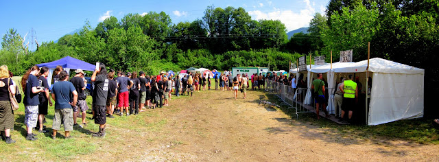 También al principio de ese camino estaba el puesto de merchandising oficial. Durante los tres años que he visitado Wacken he aprendido que la camiseta oficial del festival ha de comprarse justo después de montar la tienda de campaña, no encontrando de mi talla en caso de demorarme. En Metalcamp no se llegaron a agotar siquiera. De hecho, había camisetas de la anterior edición a 6€, cuando las de 2011, así como el resto de camisetas de los grupos que actuaban, rondaban los 20€ de precio total (o Skupaj).