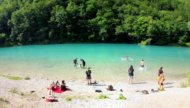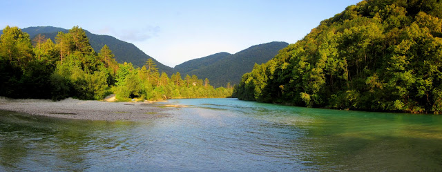 ... Y la llegada a Tolmin, cuando el autobus irrumpe en los paisajes eslovenos y no puedes evitar preocuparte al notar cómo la velocidad se reduce para evitar morir despeñados en una de las cerradas curvas que bordean las montañas… Pero ver que estás a unos pocos metros del agua cristalina de los ríos y tranquilizarte…